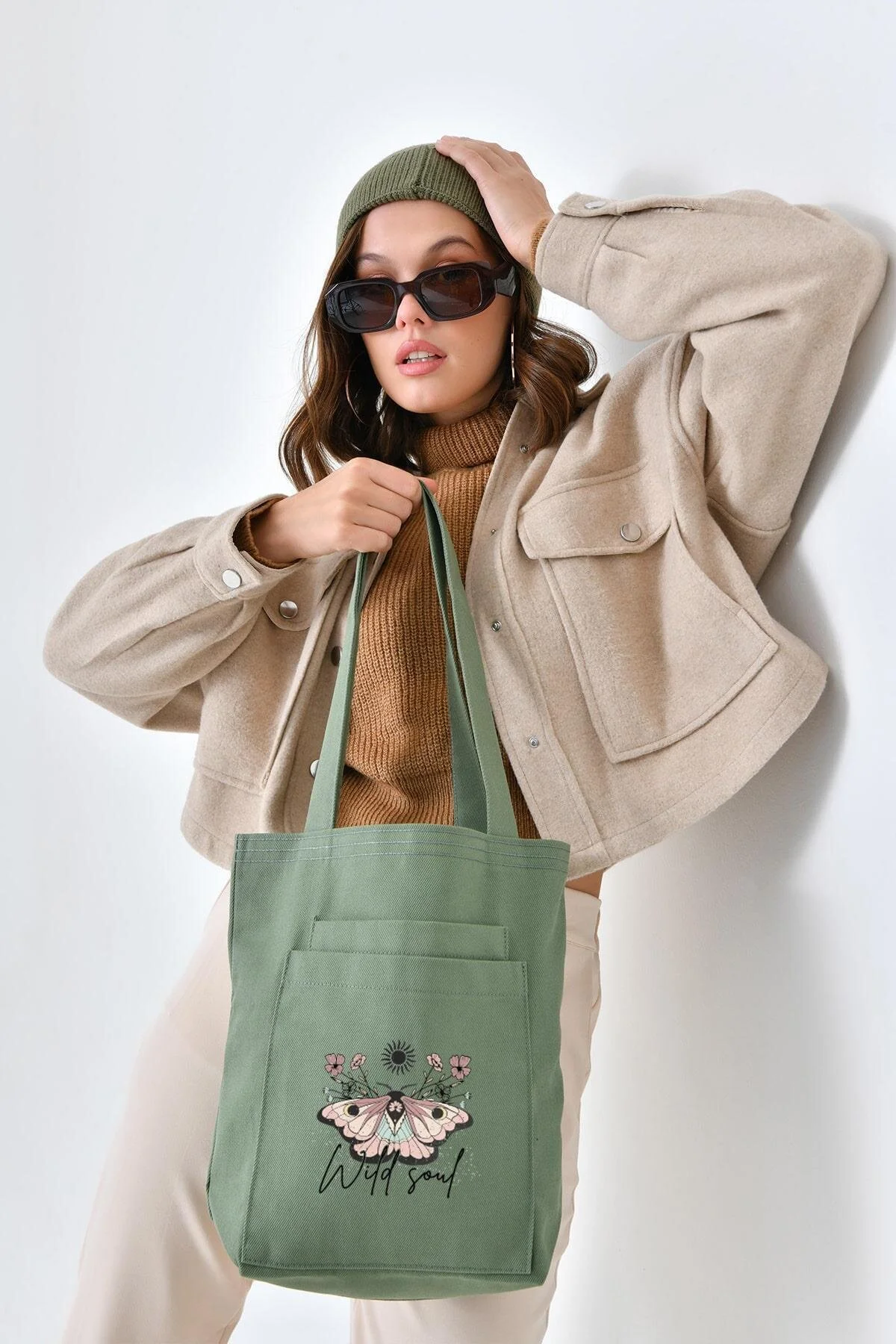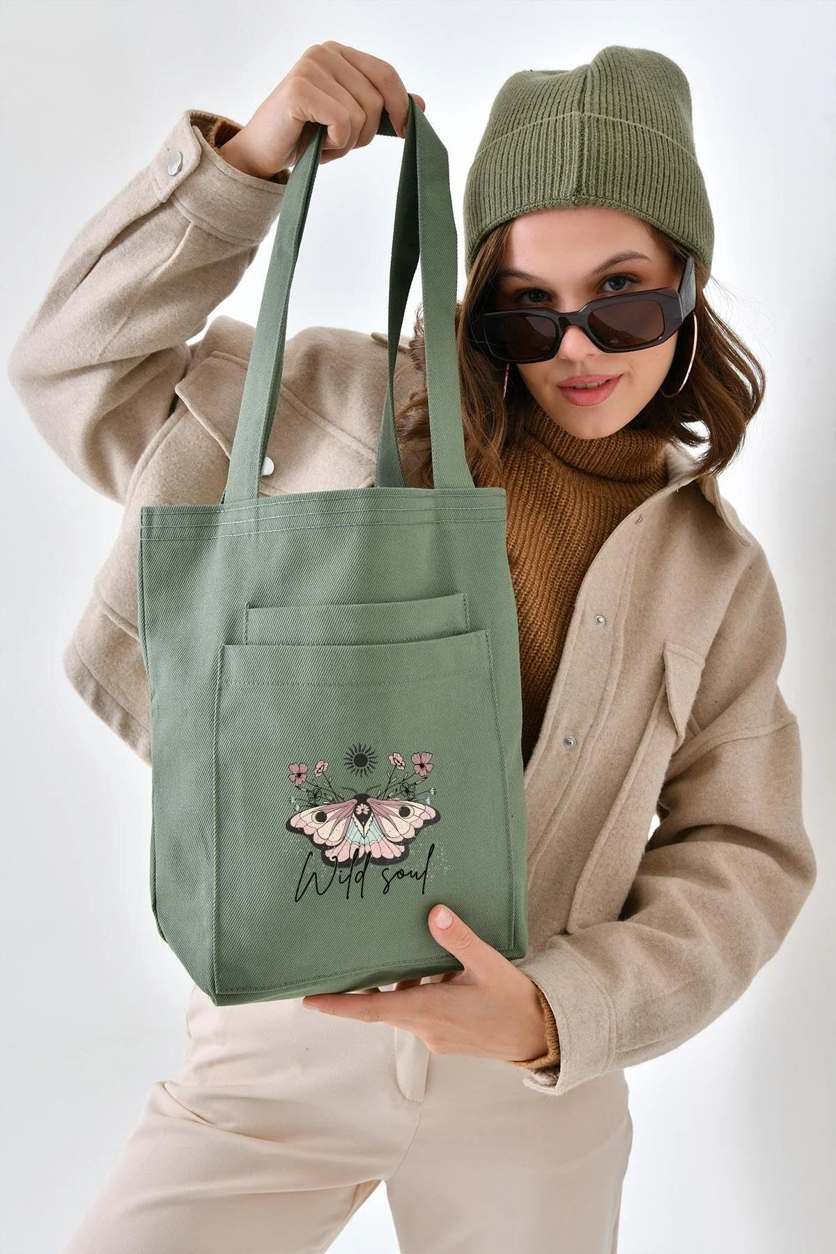 “Wild Soul” baskısı ve kelebek desen detaylarıyla öne çıkan bu mint yeşili gabardin çanta, enerjik ve özgün tarzı günlük kullanımınıza taşır. Dayanıklı yapısı ve çift ön cebi sayesinde hem şık hem de pratik bir kullanım sunar; gün boyu ihtiyaç duyduğunuz eşyaları düzenli şekilde taşımanıza yardımcı olur.
