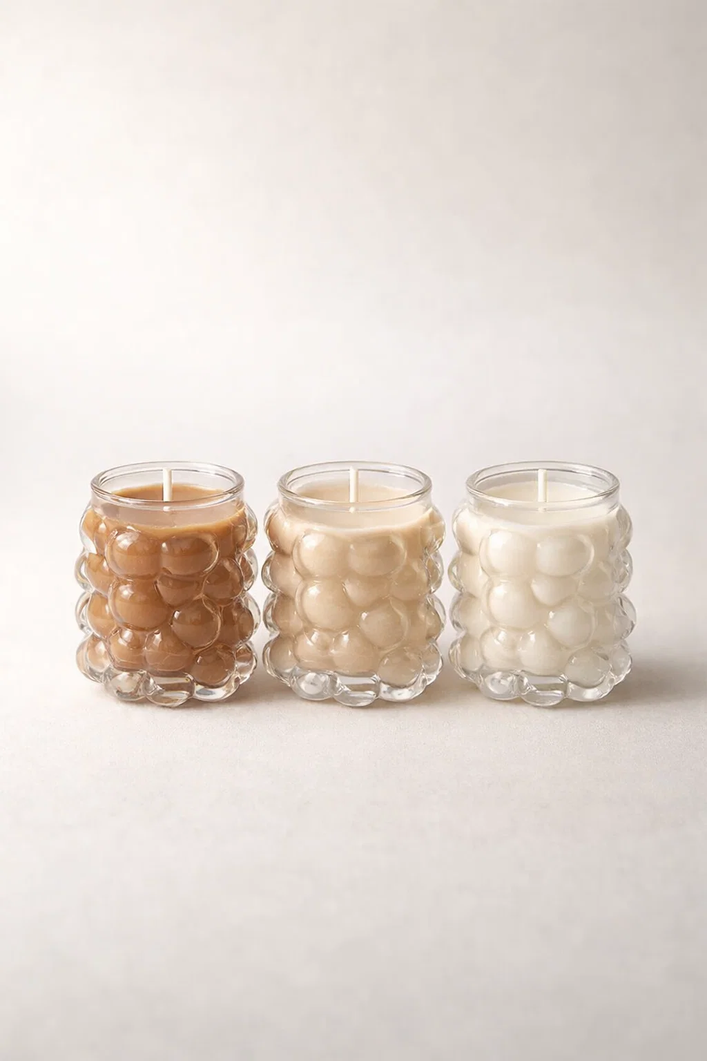 Kabartmalı cam tasarımıyla öne çıkan bu dekoratif mum seti, minimal ve sıcak tonlarıyla yaşam alanlarınıza zarif bir dokunuş katar. Şeffaf cam yüzey üzerindeki baloncuk form detayları, ışıkla birlikte hoş bir yansıma oluşturarak hem dekoratif hem de huzur verici bir atmosfer yaratır.
