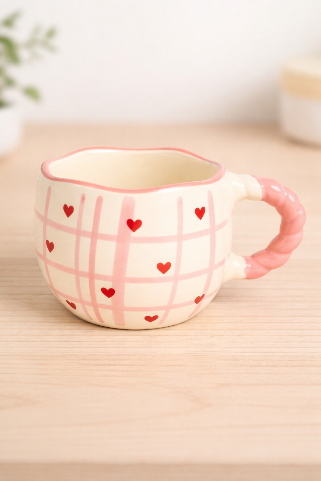 Pembe çizgili desen ve kırmızı kalp detaylarıyla tasarlanan bu porselen kupa, sıcak ve sevimli görünümüyle öne çıkar. Dalgalı ağız formu ve pembe kulp detayıyla dikkat çeken bu model, çay ve kahve keyfi için idealdir; romantik ve neşeli temalı hediye kutuları için hoş bir tamamlayıcıdır.