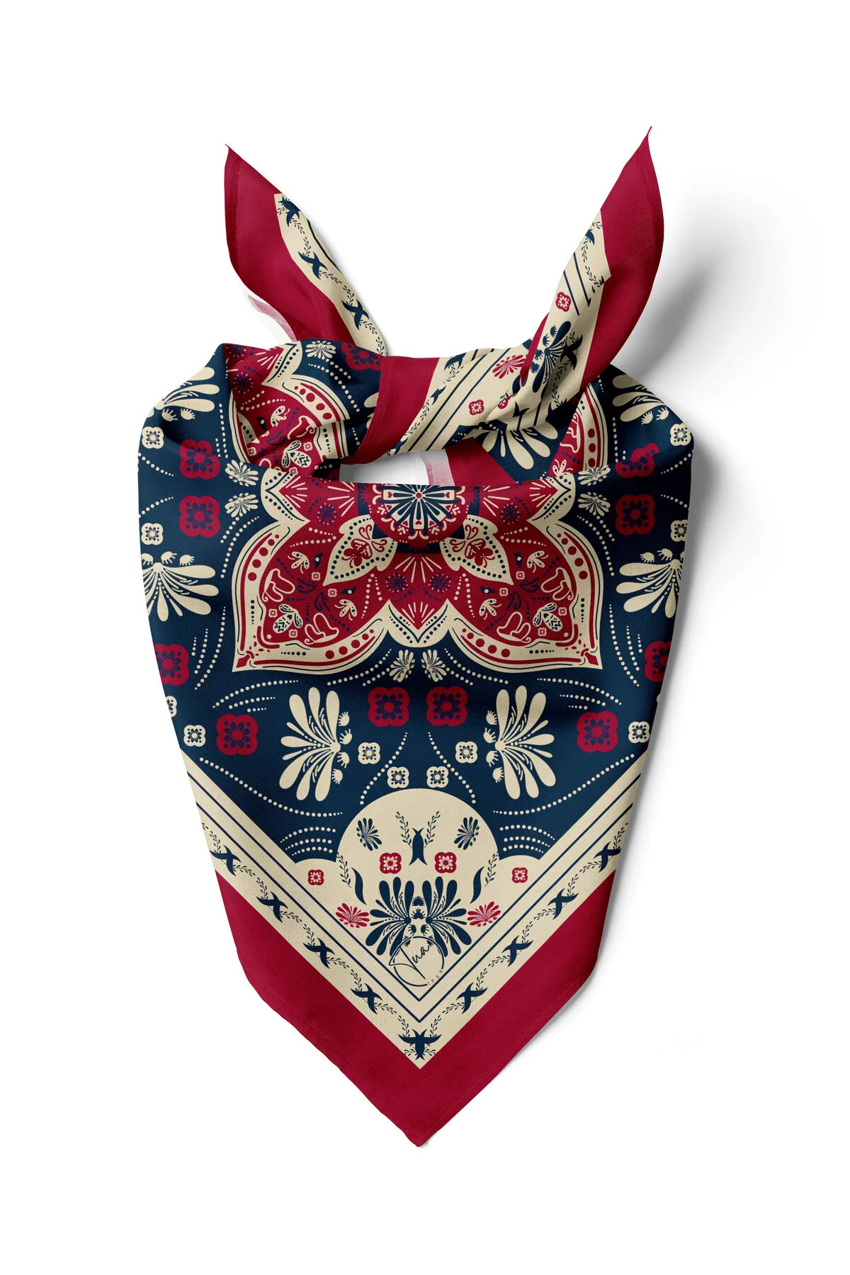 Lacivert zemin üzerine kırmızı mandala motifleri ve geometrik oymacılık desenleriyle zarif ve cesur bir stil sunar. Kolayca kombinlerinize uyum sağlar. Boyunda, çantada veya saç aksesuarı olarak rahatlıkla kullanılabilir.