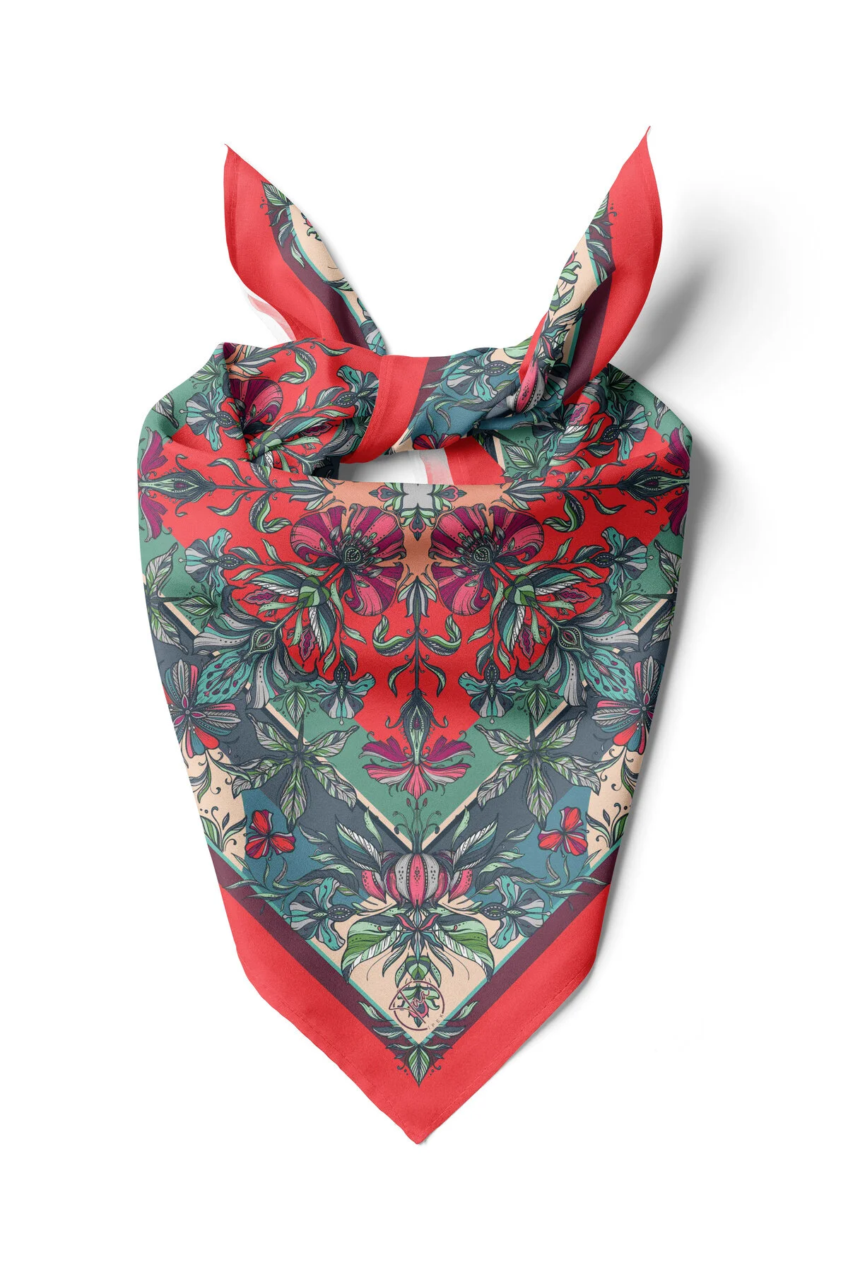Canlı kırmızı ve koyu yeşil tonlarındaki simetrik büyük çiçek motifleriyle dikkat çekici ve iddialı bir stil sunar. Her kombine dinamik ve özgün bir enerji katar. Boyunda, çantada veya saç aksesuarı olarak rahatlıkla kullanılabilir.