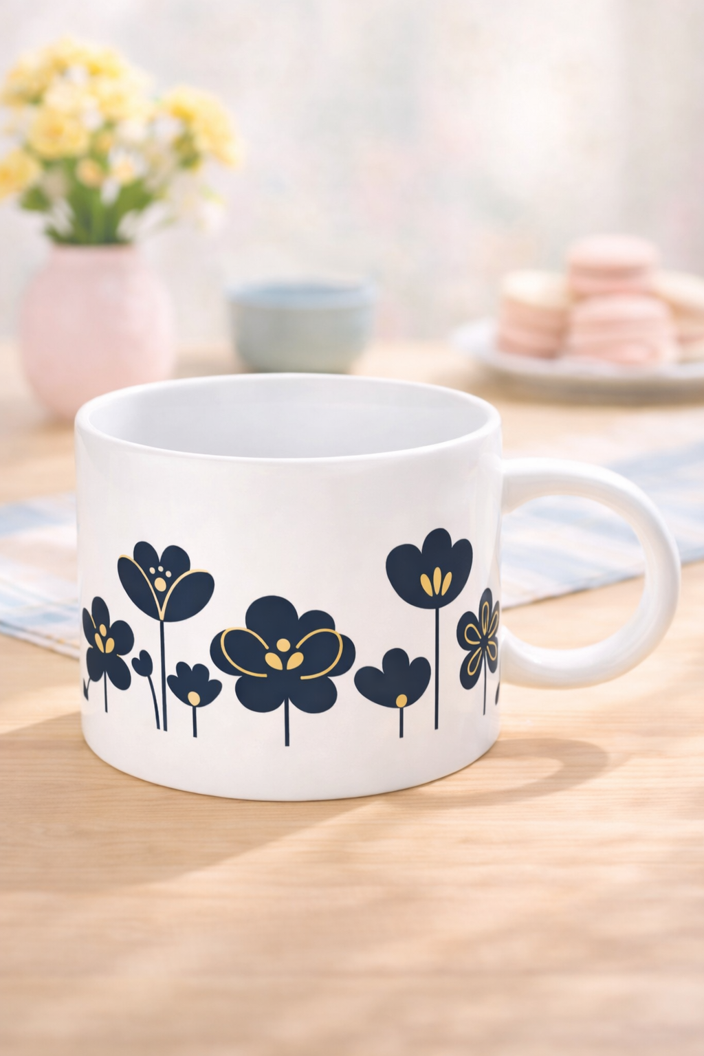 Minimal çiçek illüstrasyonlarıyla tasarlanan bu porselen kupa, lacivert ve altın tonlarının uyumuyla sade ama zarif bir görünüm sunar. Günlük çay ve kahve keyfi için idealdir; şık tasarımı sayesinde hediye kutuları için de hoş bir tamamlayıcıdır.