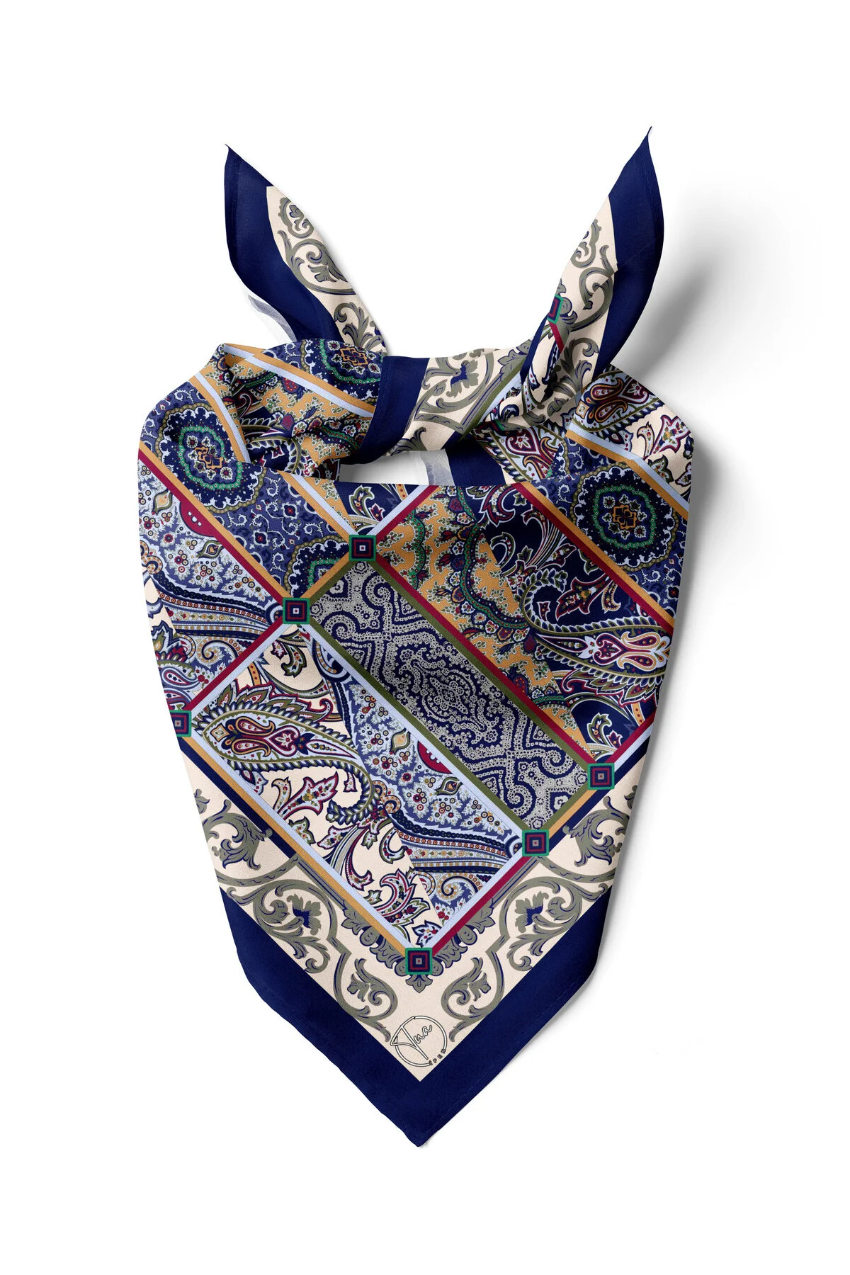 Birden fazla farklı paisley motifinin bir arada kullanıldığı patchwork tasarımıyla göz alıcı ve sofistike bir görünüm sunar. Lacivert, krem ve altın renkleri zerafeti simgeler. Boyunda, çantada veya saç aksesuarı olarak rahatlıkla kullanılabilir.