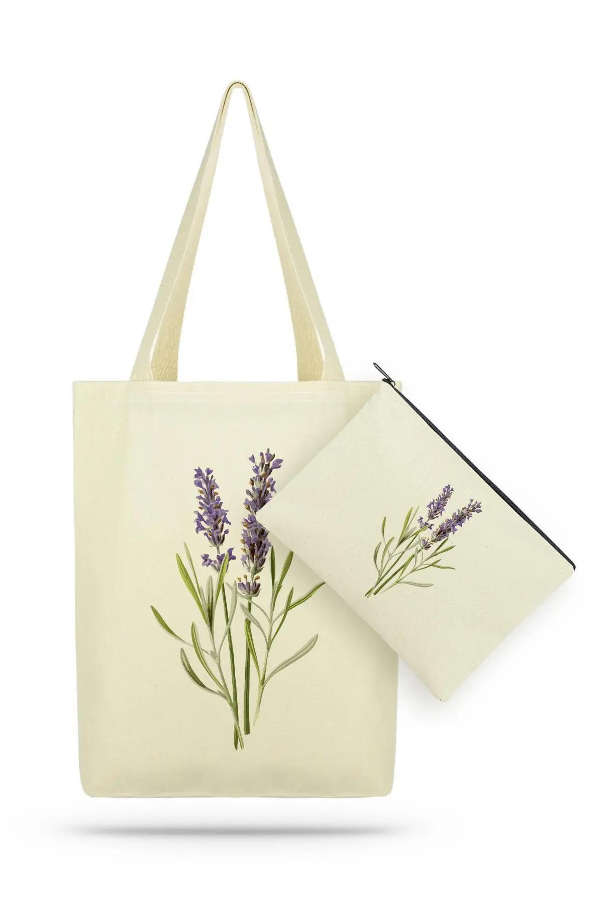 Lavanta desen detaylarıyla öne çıkan bu kanvas kumaş bez çanta seti, sade ve zarif tarzı günlük kullanımınıza taşır. Doğal dokusu ve kullanışlı yapısıyla hem şık hem de pratik bir deneyim sunar; geniş iç hacmi sayesinde gün boyu ihtiyaç duyduğunuz eşyaları rahatça taşımanıza yardımcı olur. Set içerisinde yer alan fermuarlı makyaj çantası ise küçük eşyalarınızı düzenli şekilde saklamanızı sağlar.