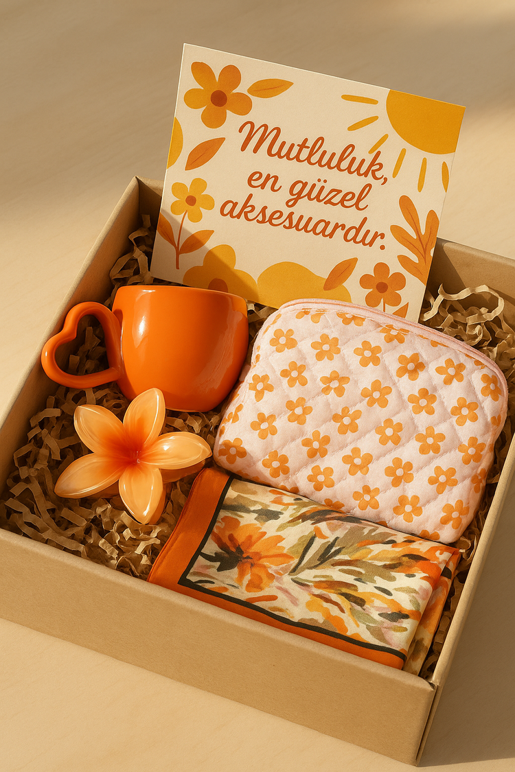 • Motto Kartı: “Mutluluk, en güzel aksesuardır.” yazısıyla kutuya pozitif bir ruh katar.