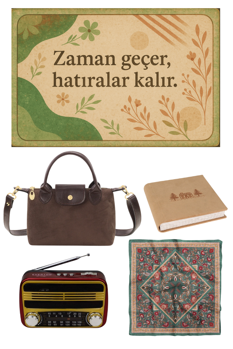 Bu kutunun içindeki her parça, geçmişe duyulan sevgiyle bugüne taşınmış küçük bir hatıra gibi. Nostaljik dokular, klasik detaylar ve sıcacık tonlar; sevdiklerine “Seni unutmadım” demenin en zarif yolu.