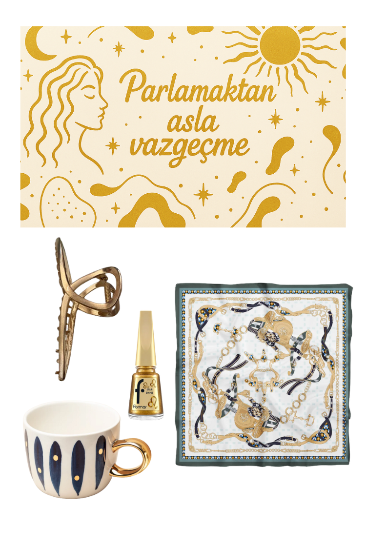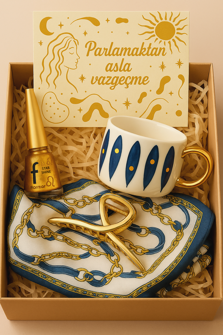• Motto Kartı: “Parlamaktan asla vazgeçme” mesajını taşıyan, altın yaldızlı çizimlerle süslenmiş özel kart, kutuya anlam ve ruh katıyor.