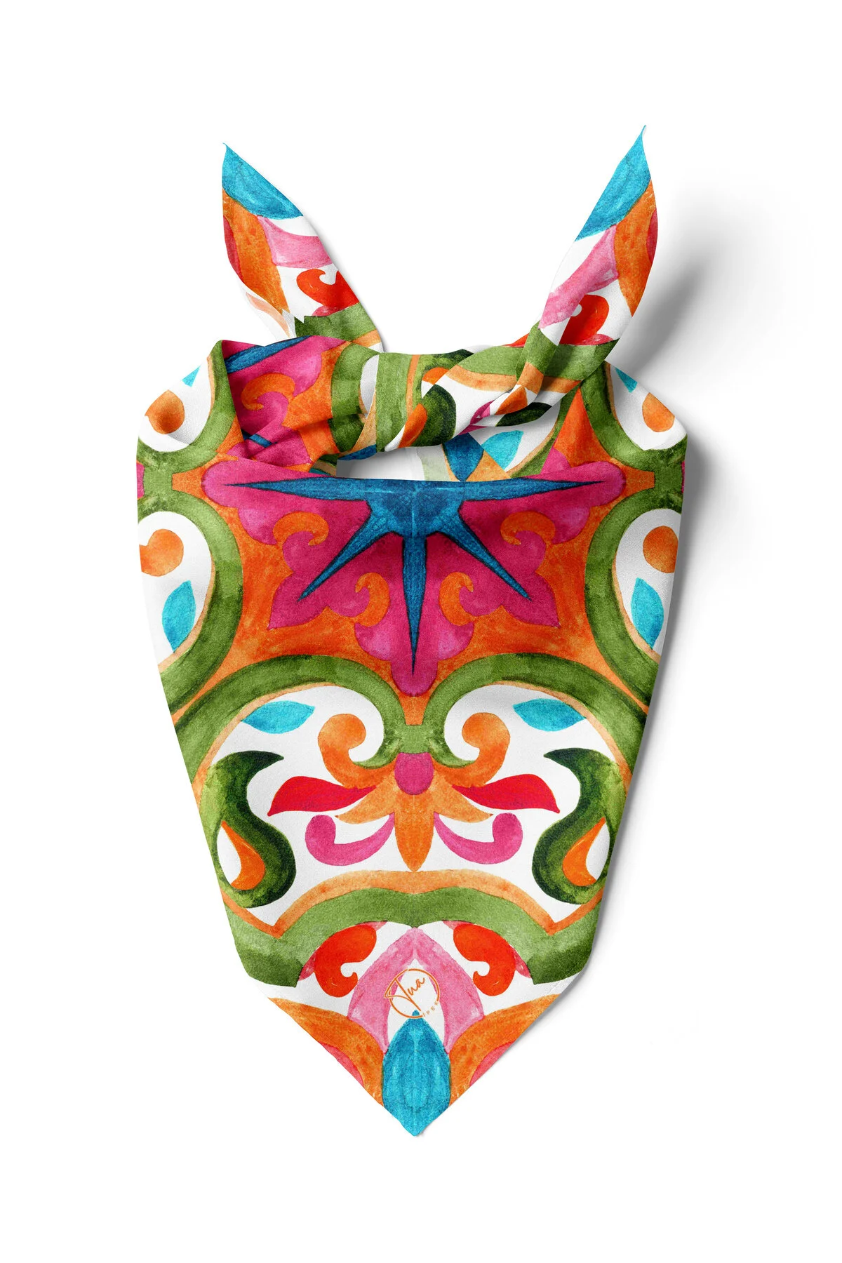 Sicilya ve Akdeniz fayans sanatından ilham alan canlı suluboya arabesk deseniyle her kombine Akdeniz’in sıcaklığını ve neşesini taşıyor. Fuşya, turuncu ve yeşil tonlardaki çarpıcı kompozisyon tam anlamıyla bir sanat eseri. Boyunda, çantada veya saç aksesuarı olarak rahatlıkla kullanılabilir.