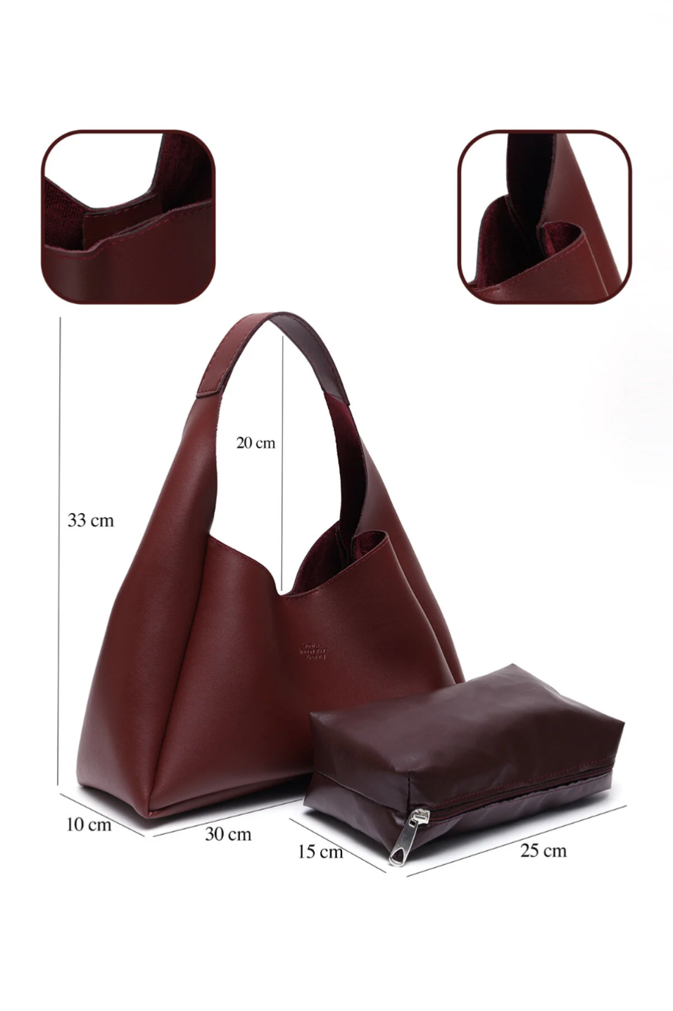 Minimal ve zarif tasarımıyla öne çıkan bu bordo suni deri çanta, günlük kullanımda şıklık ve fonksiyonelliği bir araya getirir. Yumuşak formu ve sade görünümü sayesinde kombinlerinize kolayca uyum sağlar; içindeki fermuarlı makyaj çantası ile eşyalarınızı düzenli şekilde taşımanıza yardımcı olur.