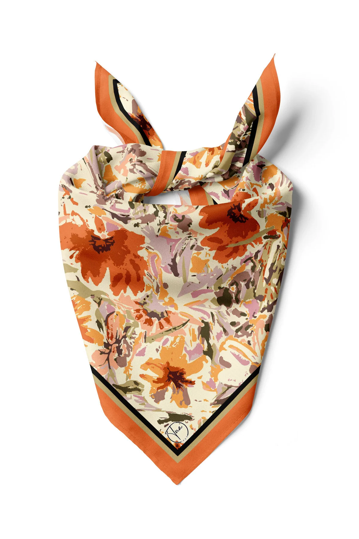 Canlı turuncu tonları ve çiçek desenleriyle kombinlerinize enerjik ve zarif bir dokunuş katar. Günlük kullanıma ve özel kombinlere kolayca uyum sağlar. Boyunda, çantada veya saç aksesuarı olarak rahatlıkla kullanılabilir.